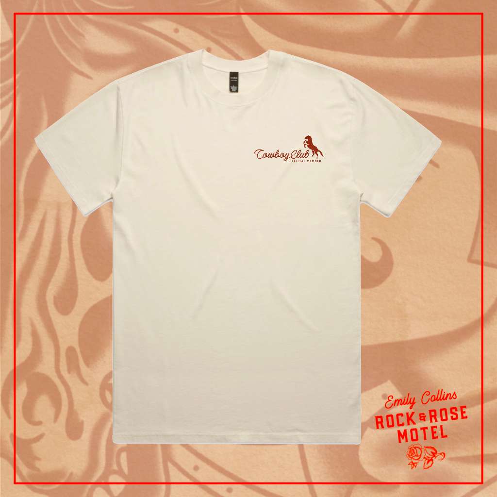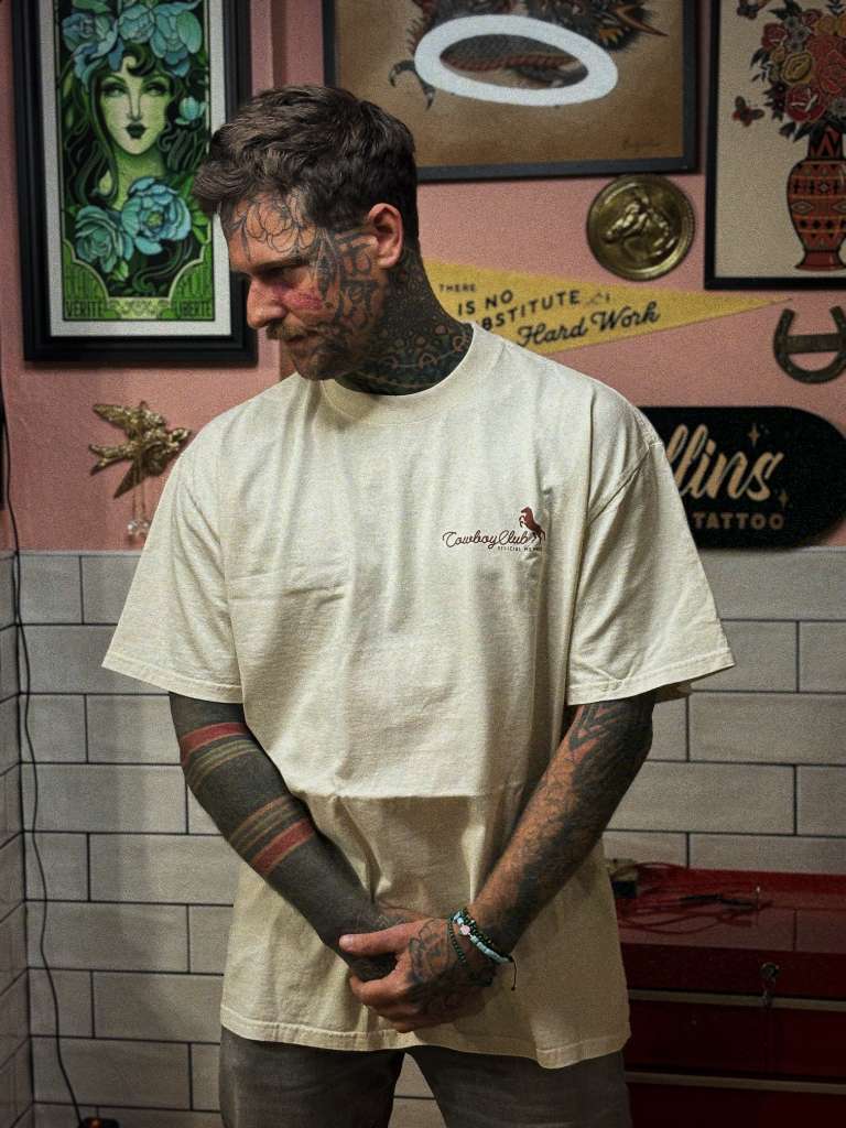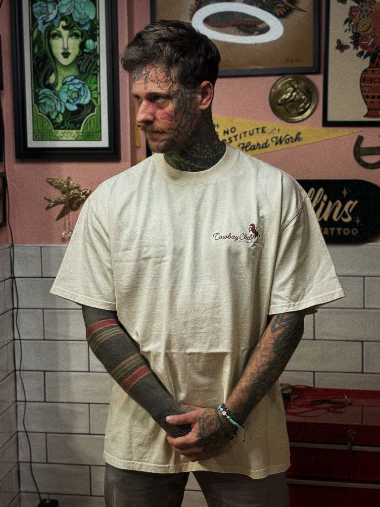 The Cowboy Club T-Shirt is a rugged classic with a bold Western-inspired design. Made from 100% cotton, this tee offers durability and comfort in a heavy 240 GSM weight that feels substantial yet easy to wear. The garment-dyed finish in an earthy ecru tone gives it a timeless, worn-in look that only gets better with age.