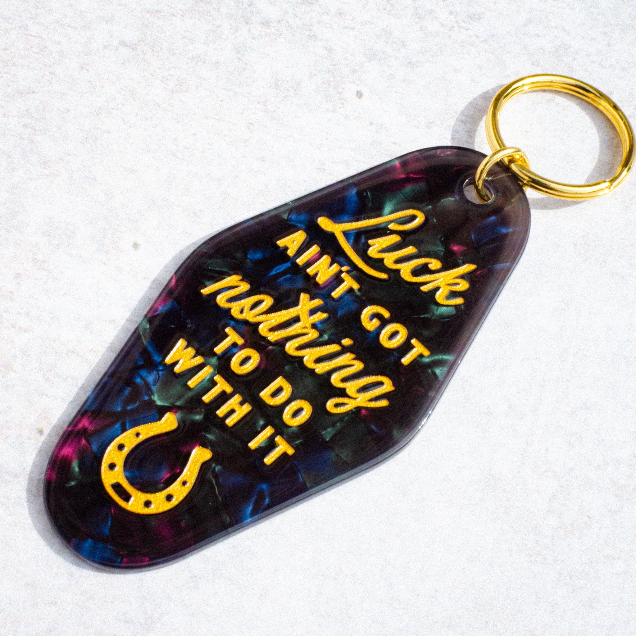 Our sleek black pearlescent motel keyring brings sass and sparkle in equal measure. With bold yellow embossed lettering and a golden horseshoe, it’s the perfect reminder that you make your own luck. Clip it to your keys or bag and keep that confident, can’t-stop-me energy with you everywhere you go! ✨🔑