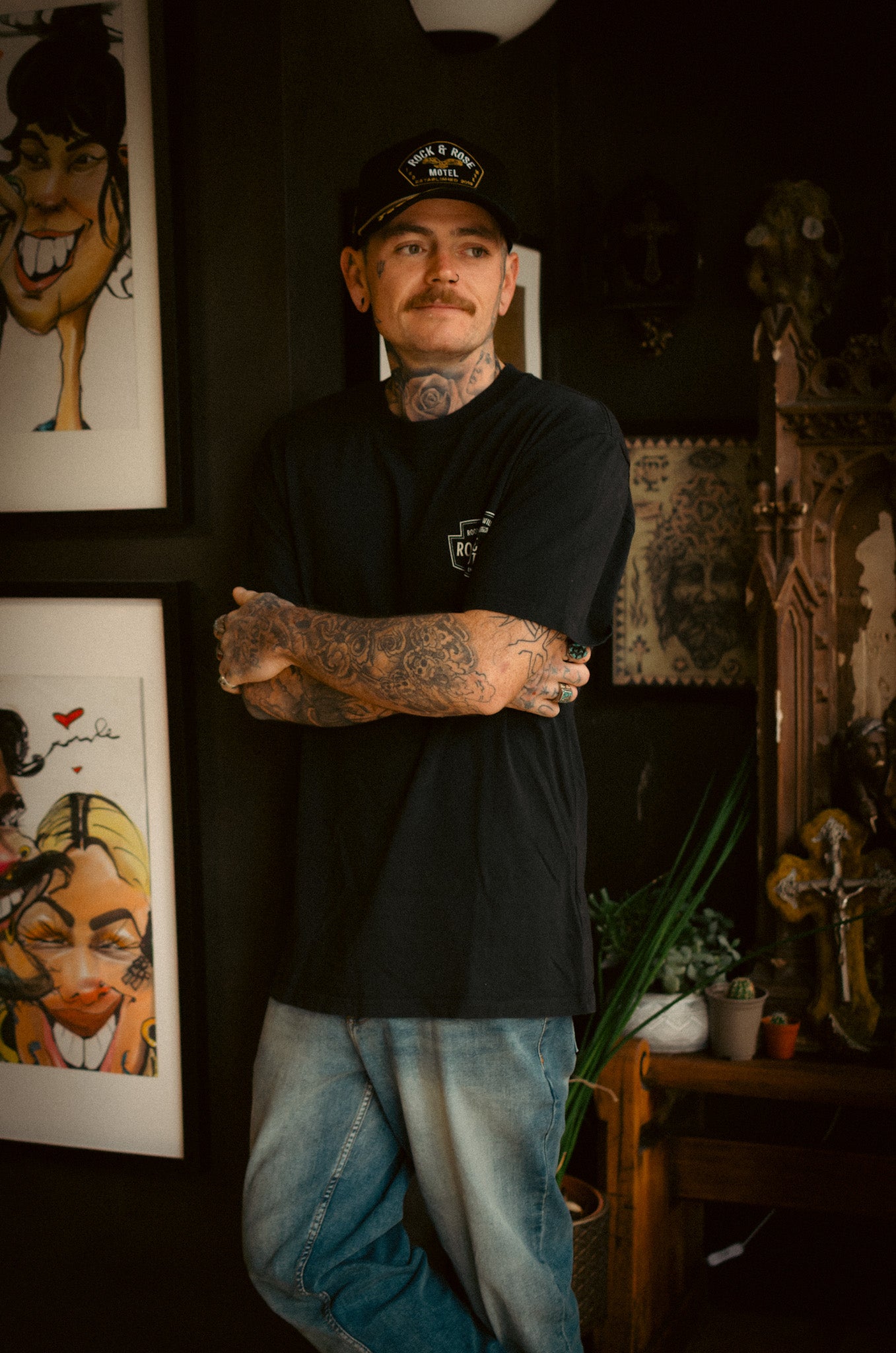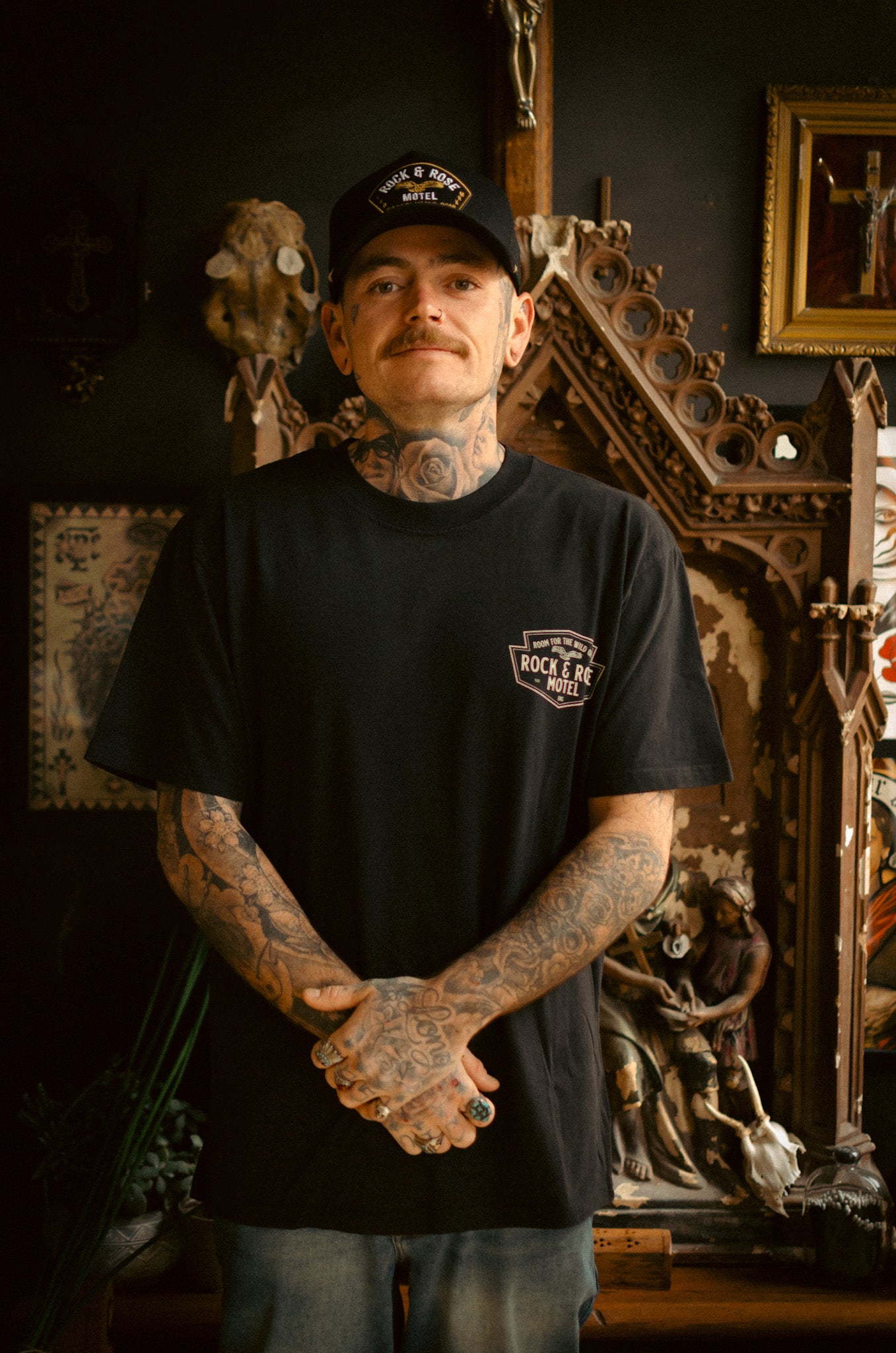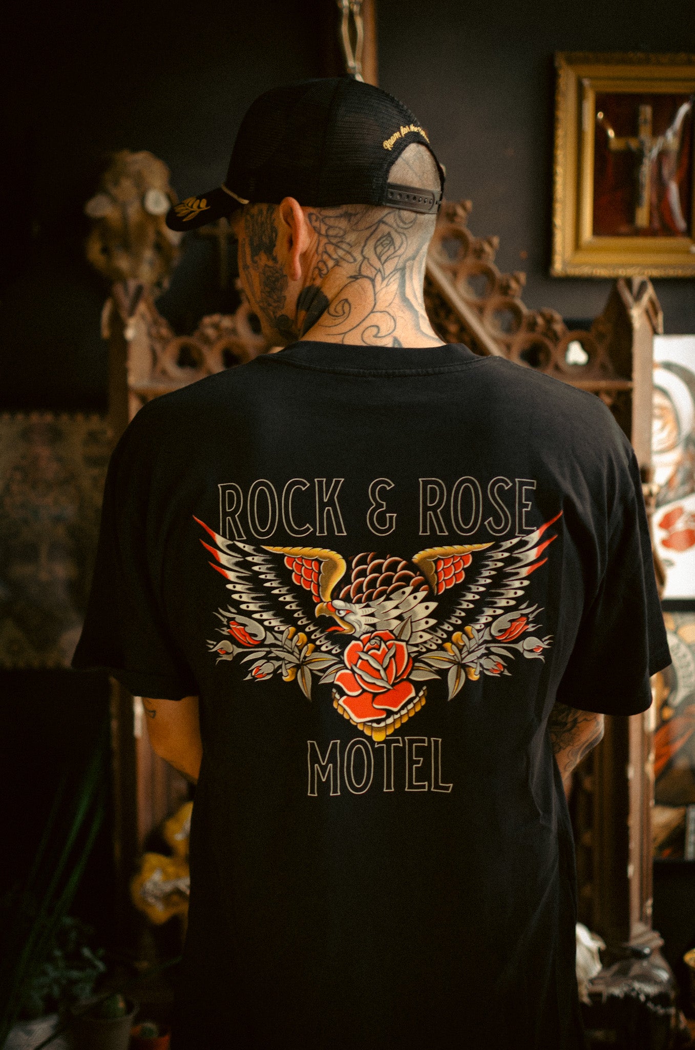 Rock and Rose Motel Traditional Eagle T-Shirt. Made from heavyweight 240 GSM cotton this tee delivers that worn-in feel with lasting quality. The boxy, oversized fit and dropped shoulders keep it relaxed and effortless.