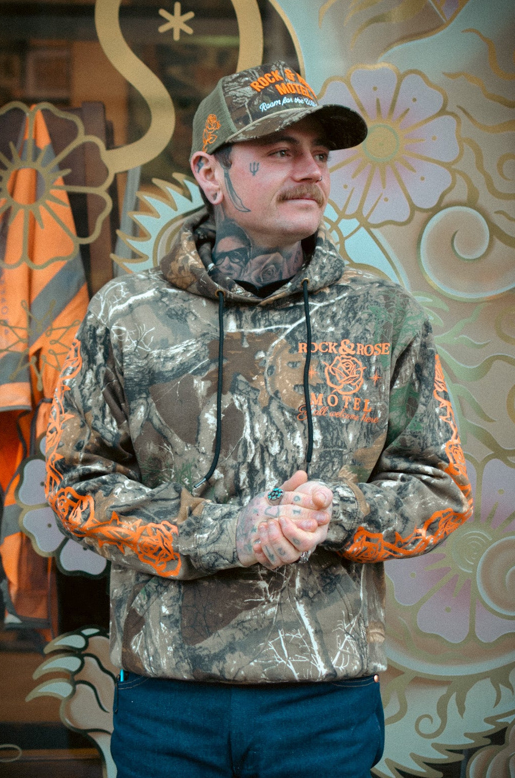 Rock And Rose Motel Hoodie Hunting Camo and Orange